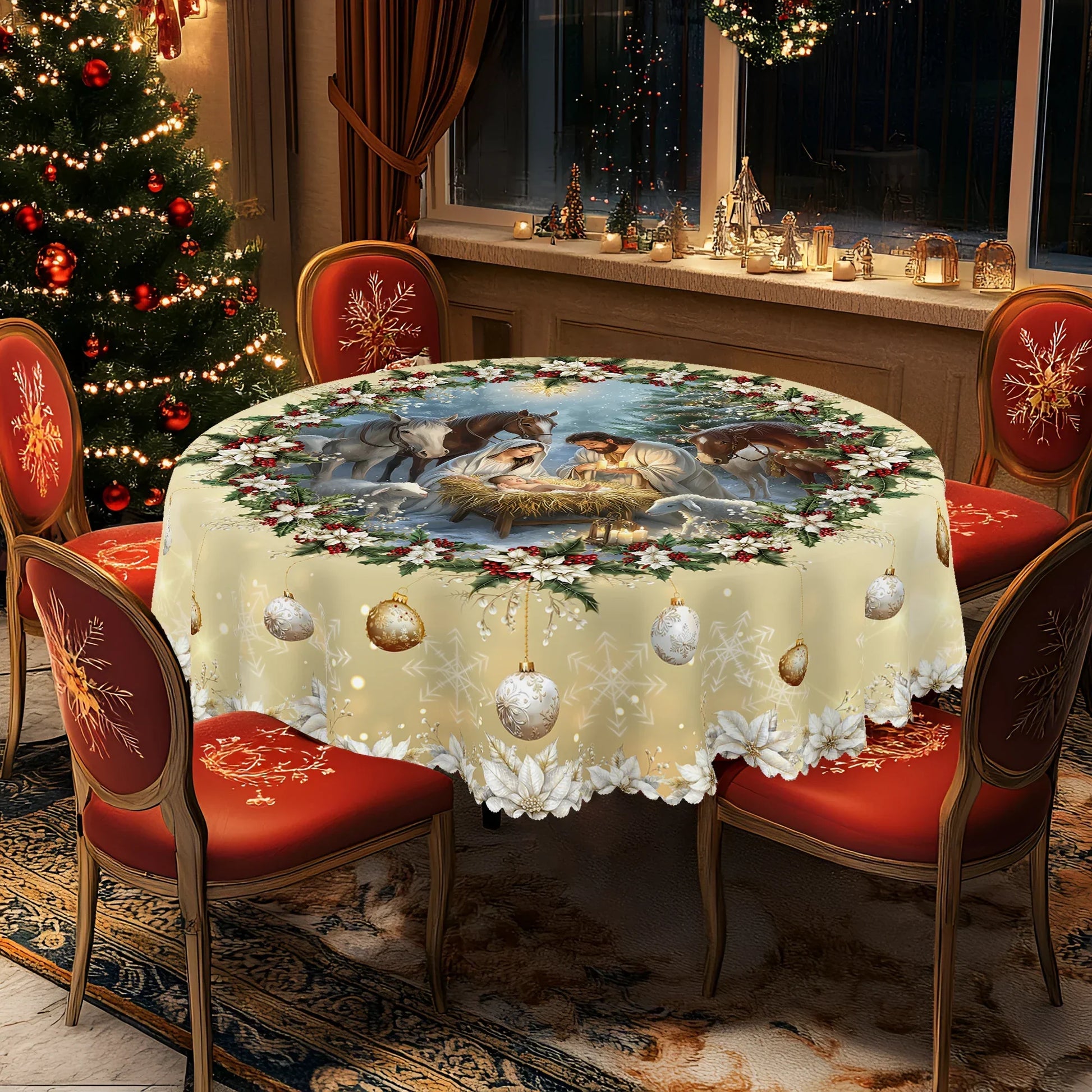 Bring the spirit of the season to your dining room with this beautifully designed festive tablecloth. Featuring a detailed nativity scene surrounded by holly and ornaments, it adds a meaningful and elegant touch to every Christmas gathering.